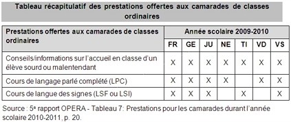 Dans tous les cantons, on retrouve une palette de prestations destinées à l’entourage des élèves sourds ou malentendant-e-s. En dispensant de l’information, des conseils et des compétences à l’entourage des élèves sourd-e-s et malentendant-e-s, ces prestations facilitent la communication et permettent une meilleure prise en compte des besoins de l’élève sourd-e ou malentendant-e, ce qui facilite son intégration et contribue à son bien-être.